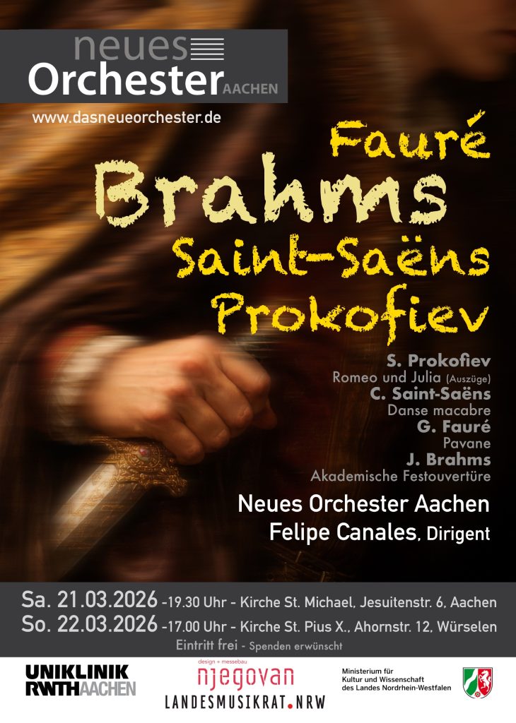 Das Neue Orchester Aachen existiert in der heutigen Form seit 2000. Unsere Besetzung entspricht einem Kammerorchester, wir wachsen aber gerne zu einem kleinen Sinfonieorchester heran. Seit Januar 2015 ist unser Dirigent und musikalischer Leiter Felipe Canales. Wir freuen uns immer über Verstärkung. Fortgeschrittene Amateur-MusikerInnen, die Spaß daran haben, regelmäßig gemeinsam zu musizieren, und in freundlicher, konzentrierter Atmosphäre Werke vom Barock bis zur Moderne zu erarbeiten, können sich jederzeit bei uns melden.